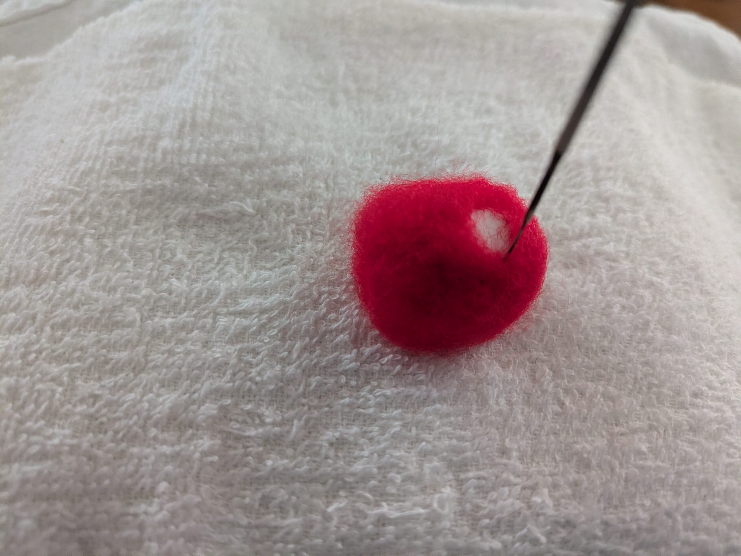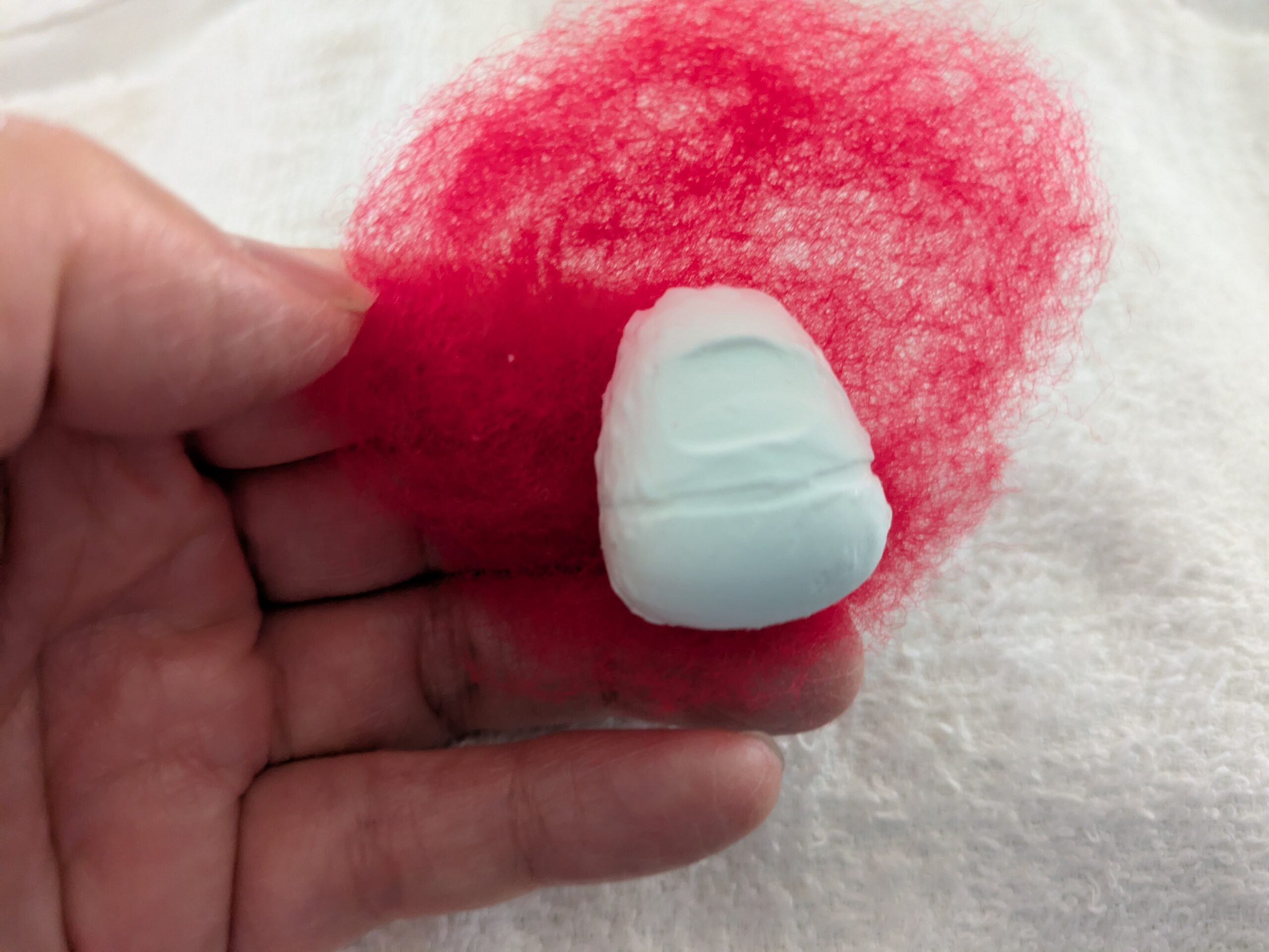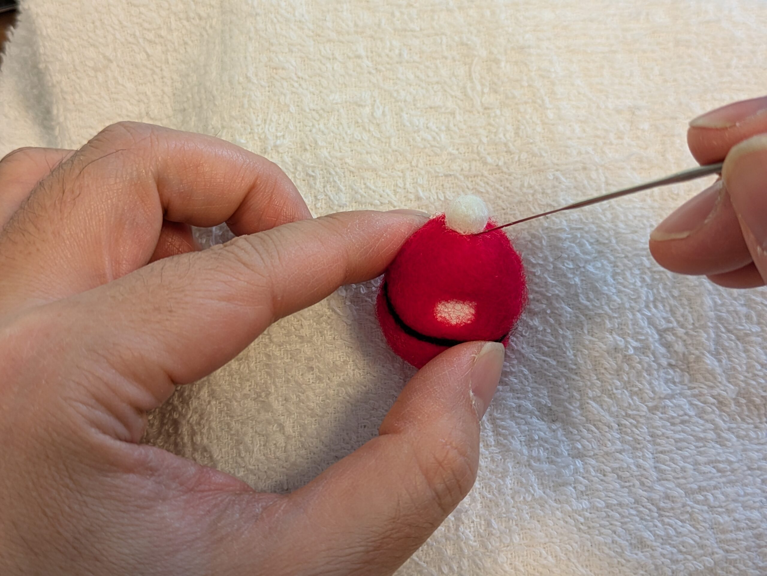 - 少量の白いアクレーヌを丸くまとめ、頭の先にニードルで刺しつけて固定します。